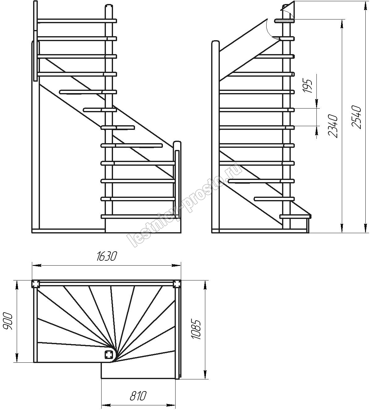 Деревянная межэтажная лестница ЛЕС-01 2340-2540 проем 1630-900, Бук