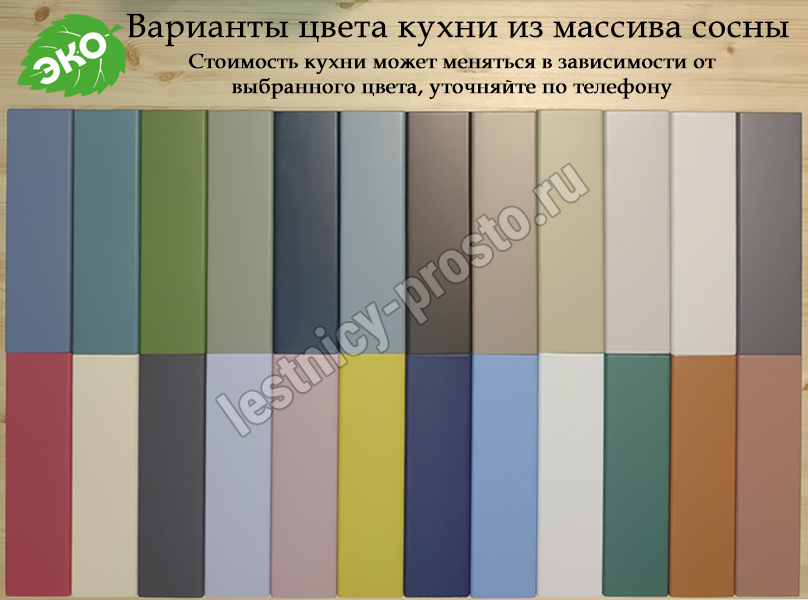 Угловой кухонный гарнитур из 100% массива сосны размером 2 на 1,4 и высотой 2,14 метра (верхние шкафчики 72 см). Цвет на выбор - 27 вариантов (при заказе кухни в нашем интернет магазине просьба указывать название цвета в комментариях).