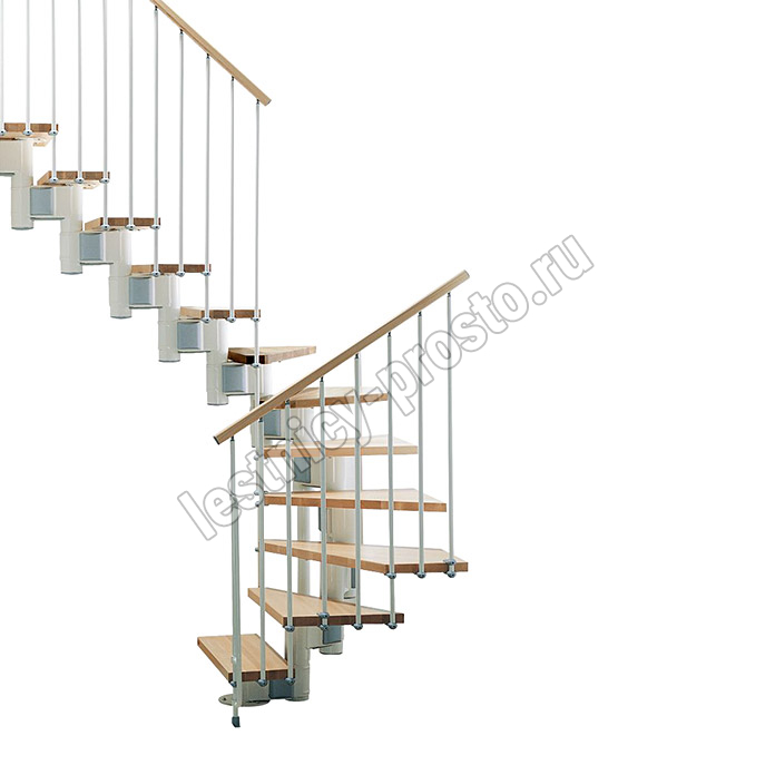 При монтаже этой лестницы, возможно регулировать высоту и глубину шага, таким образом можно получить лестницу под высоты этажа в диапазоне 2250 - 3030 мм, кроме того, установив дополнительный комплект увеличения высоты, можно поднять высоту лестницы до 3730 мм. Ширина проступи регулируется при монтаже в пределах 180 - 220 мм. Каркас и стойки ограждения выполнены из пластифицированного металла. Уникальный модульный каркас позволяет собрать лестницу необходимой формы.
