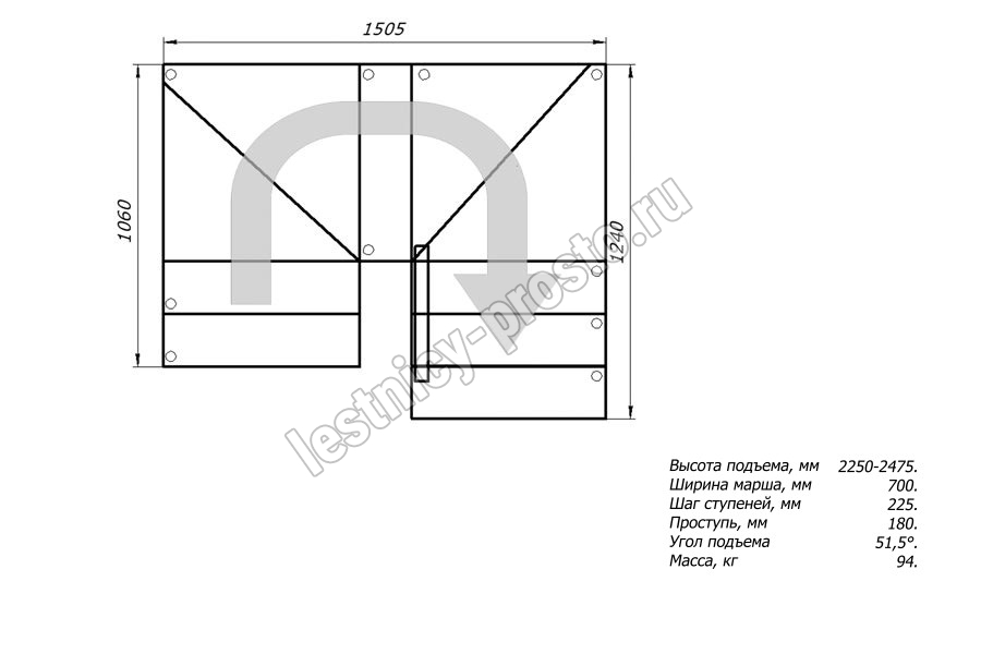 Модульная малогабаритная лестница Эксклюзив 2250-2475, Серый, Сосна, Нержавеющая сталь