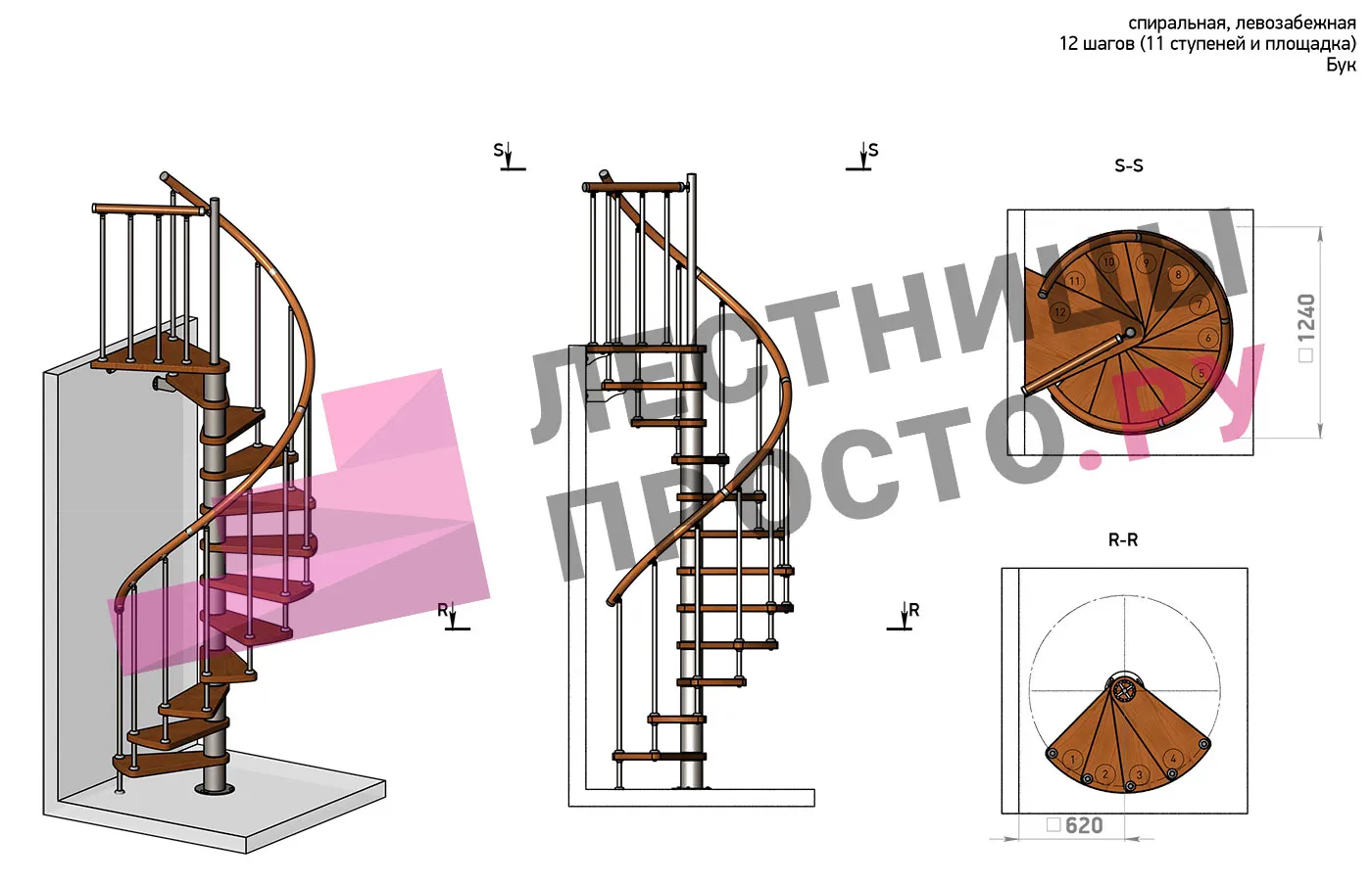 Винтовая лестница Prosto Spiral White D120см, h303.9-348,1 см, бук |