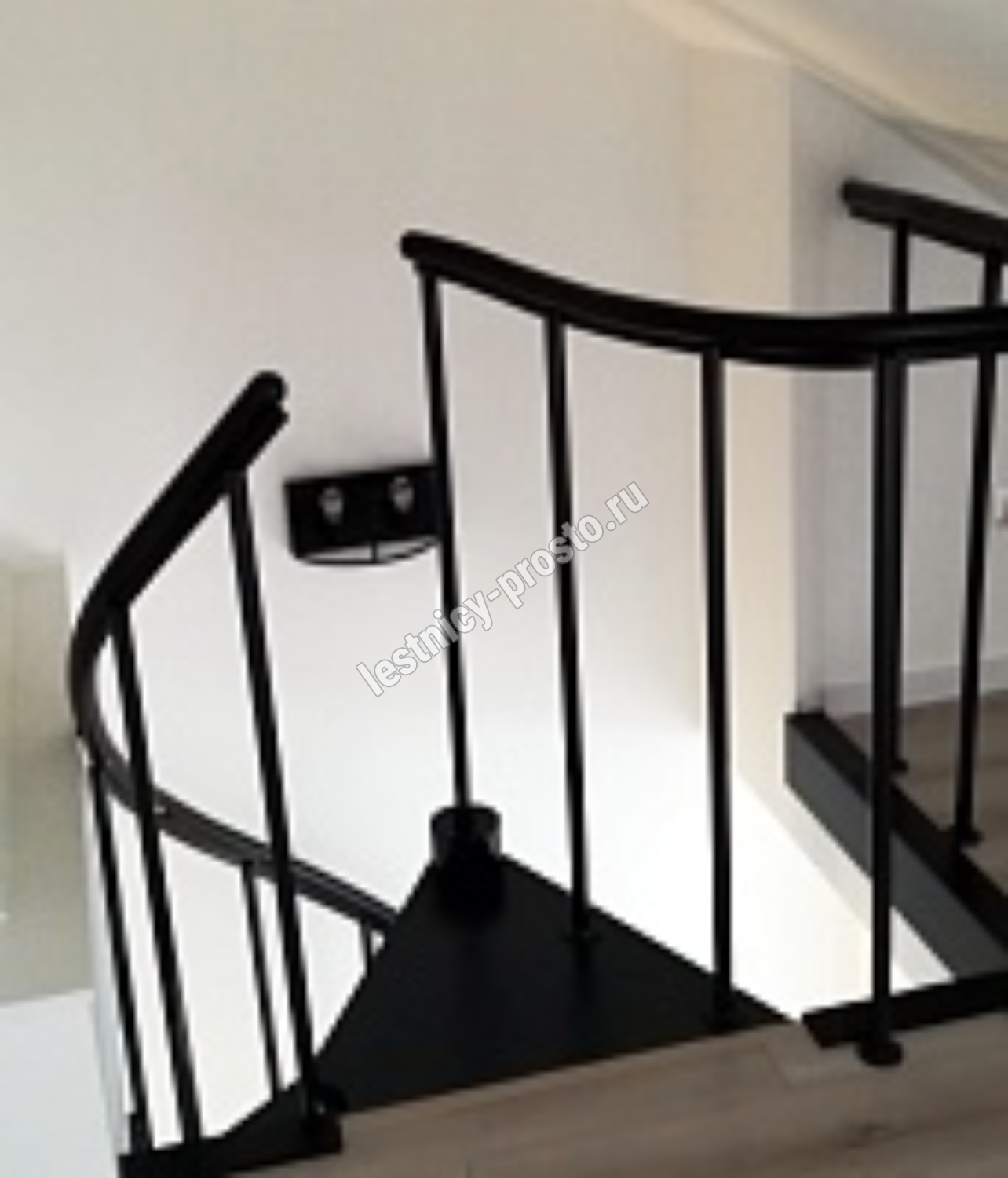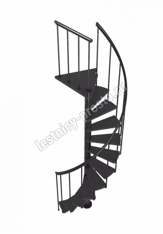 Ступени лестницы изготовлены из бука по технологии MULTIPLEX и покрыты износостойким защитным лаком. Лестница монтируется как по часовой стрелке, так и против. Возможен монтаж в круглый или квадратный проём. Ограждение: стальные трубки, Ø25 мм RAL 7016. Поручень: гибкий цельный ПВХ-поручень Ø40 мм антрацитового цвета. Конструкция и балюстрада окрашены порошковым способом в антрацитовый цвет (RAL 7016).